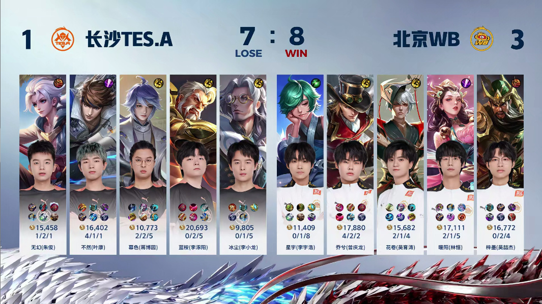 21分半,梓墨(吴喆杰)关羽在下路牵制对方对人,北京WB趁势拿到风暴龙王。25分半,北京WB再次收下风暴龙王,随后向水晶发起最后的总攻。26分钟,北京WB三线齐进,破掉水晶,拿到常规赛七连胜!