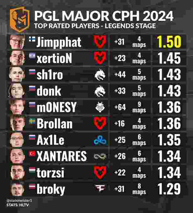 在PGL 哥本哈根Major传奇组阶段结束之后,有CSer统计了传奇组阶段选手们的rating排行榜。