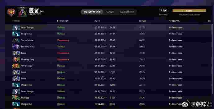 Entity的一号位选手医者Watson在前两天公布了自己大号的天梯积分。经历了13场10胜的单排冲分后,Watson冲上了13500分,这是DOTA2历史上第一个13500分,他创造了历史!最近职业选手们都在突破自己曾经的天梯分记录,这和V社封禁了职业选手们大量的小号有关,导致职业选手们都在打大号天梯,顶分局的竞争非常的激烈,能从这个环境中杀出重围登顶天梯第一,Watson的实力可想而知。