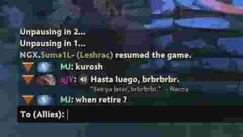比赛刚开始,COPPYBEBRA的四号位选手MJ就展示了他的“社交技巧”,在公屏上调侃Nigma的老将KuroKy:“KKy老哥,你打算啥时候退役啊?”但Nigma的队员们都不是爱回嘴的主,他们选择游戏中回应。