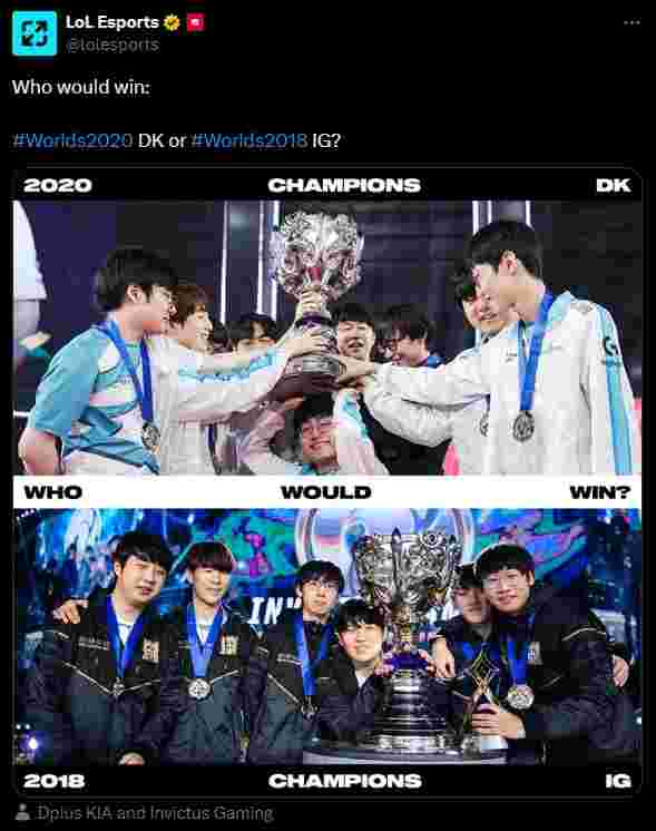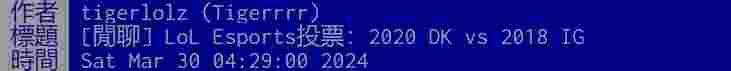3月20日,LOLEsports官方在推特发布投票,2020年DK(DWG)对阵2018年IG,谁会赢,这一话题引起了中国台湾PTT论坛网友的热议: