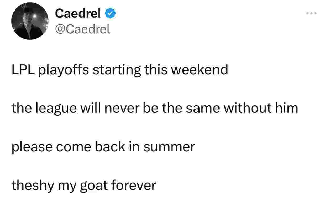 3月31日,知名Shy粉、解说Caedrel在推特上表达了自己对程璐的思念之情,其情真意切的说道:没有他一切都变了 夏季赛回来吧程璐!