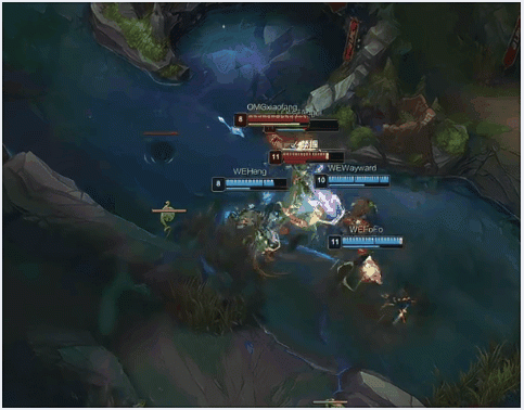 第21分钟,WE在河道找到机会开到猴子,但第一时间没能打满伤害,反倒己方下路双人组被追死,OMG顺势开打大龙,WE依旧选择来接,但被OMG打出完美拉扯接连击杀三人。