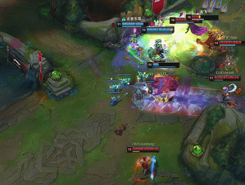 第30分钟,盲僧在中路再次找到机会眼闪w踢回泽丽成功完成1换1,OMG顺势中推再杀一人后成功拆掉WE中路高地塔。