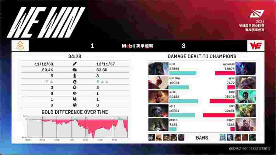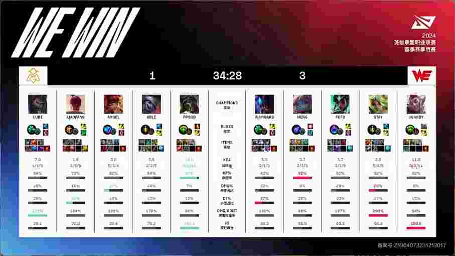 第28分半,WE中路打出漂亮配合,风女击飞酒桶大招炸回直接秒掉洛。WE推掉了两路高地,随后拿下听牌龙。