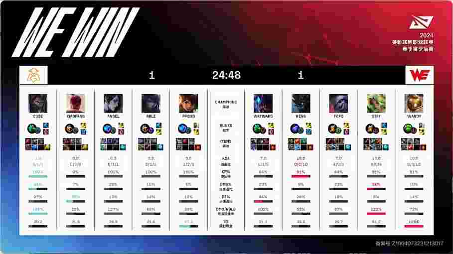 第24分钟,WE推进高地,厄斐琉斯被巴德金住,被小炮配合雷克塞合力击杀。WE打出0换2想直接一波了。雷克塞冲泉情谊相送避免了OMG被零封,WE轻松扳平比分。