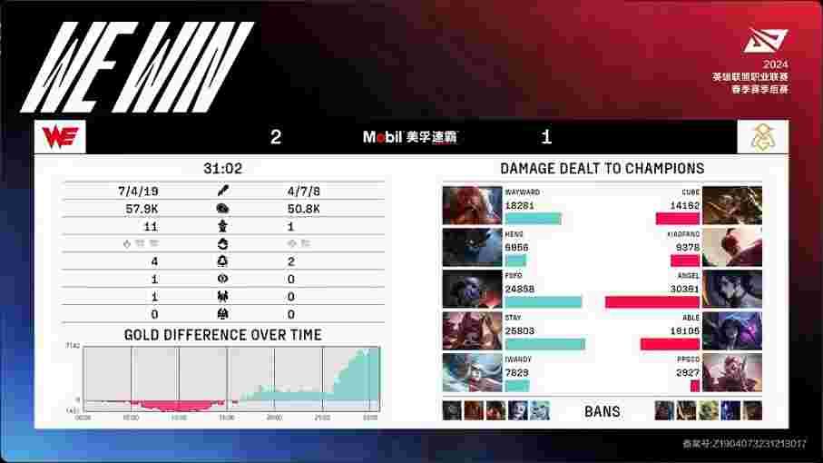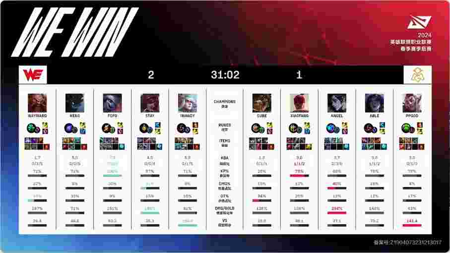 第33分钟,WE在中路找到机会成功集火秒掉列娜塔,WE顺势中推,雷克塞闪现W顶到小炮配合队友完成秒杀,剩下的OMG众人难以处理泽丽,WE成功一波结束了比赛。