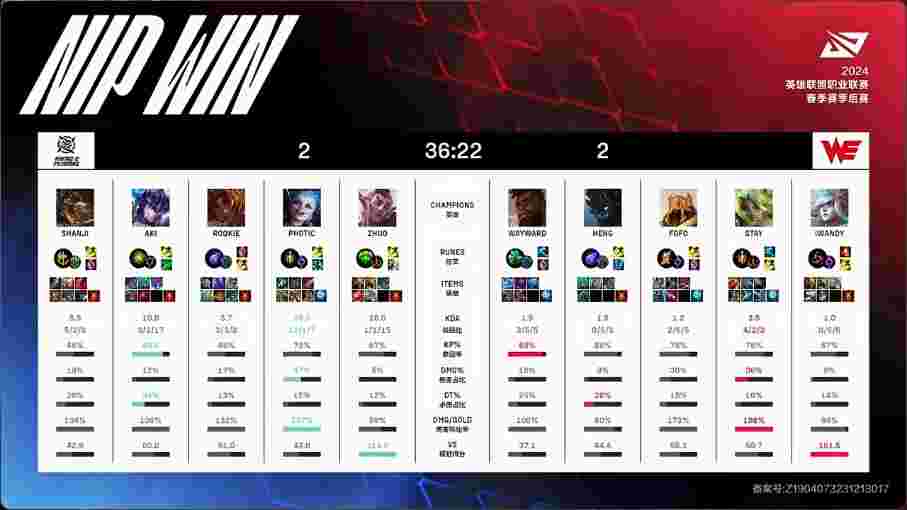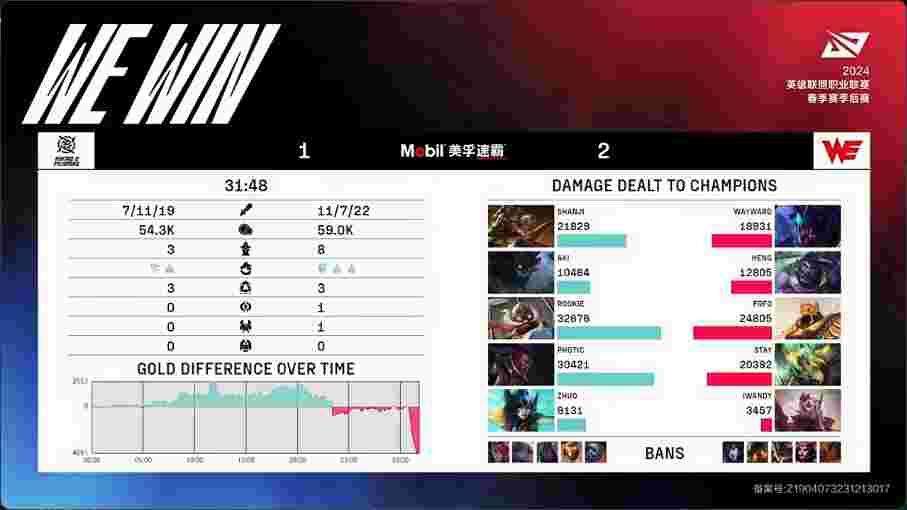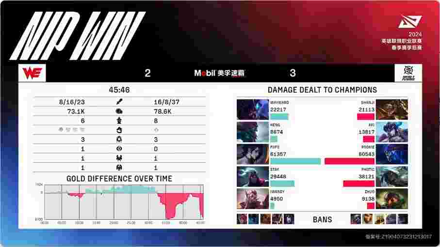 第33分钟,WE中下分推成功拆掉NIP三路高地,NIP试图最后一搏,但无奈经济差距太大,WE击杀多人后一波结束了比赛。