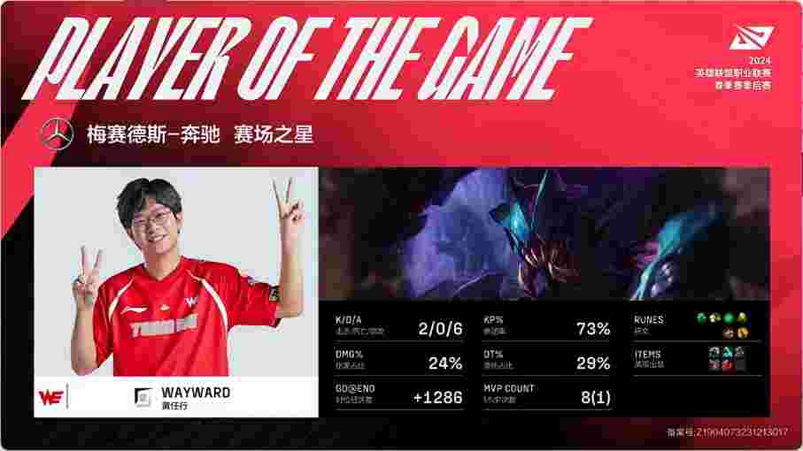 第30分钟,WE五人上路推进,永恩Q3闪找到机会配合猪妹成功切死泽丽并配合队友击杀雷克塞,但后续沙皇无人可以限制,WE还是推掉了上路高地。