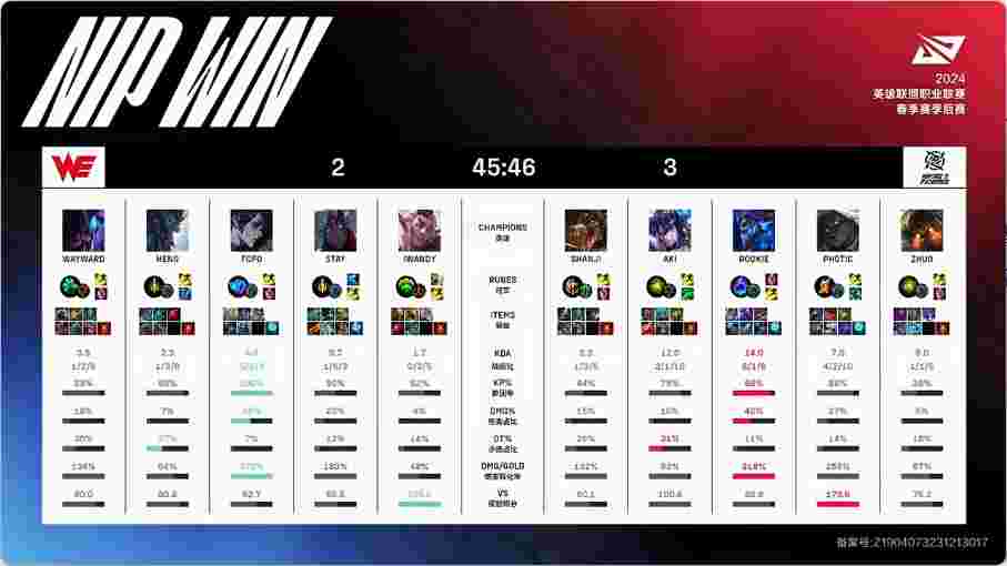 第44分钟,双方爆发远古龙团战,洛进场RW开团被龙王躲开交出大招,WE众人被打至半血,猪妹抢下小龙,NIP众人一拥而上轻松打出一波1换4后一波结束了比赛。