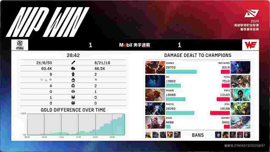 第16分钟,双方在河道开团,鳄鱼TP下来开大1V5原地转圈被杀,WE中路放出先锋撞掉NIP一塔,WE回头收掉小龙,双方经济差距不大。