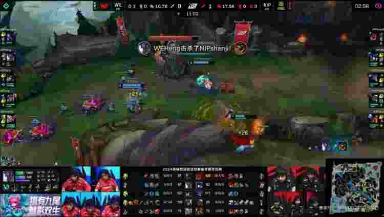 第36分钟,双方在远古龙处拉扯,猪妹残血吃果子回血,龙王侧面被洛抬起扔出与陨石,挖掘机击杀龙王,赛娜收掉洛,猪妹残血被慧天火砸死,WE收掉远古龙,慧击杀赛娜,WE打出2换3,但NIP经济依旧领先3k。