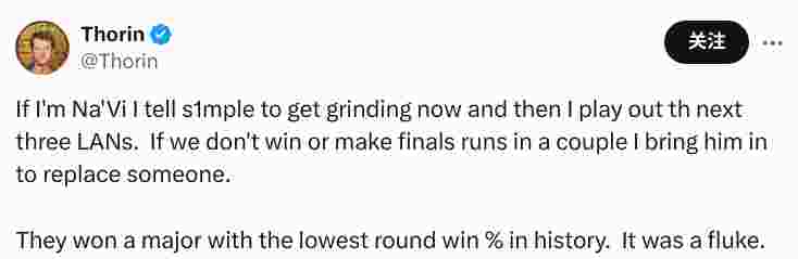 Natus Vincere夺得PGL 哥本哈根Major的冠军之后,Thorin在个人推特上分享了自己的观点,在他看来NaVi夺冠只是个偶然。