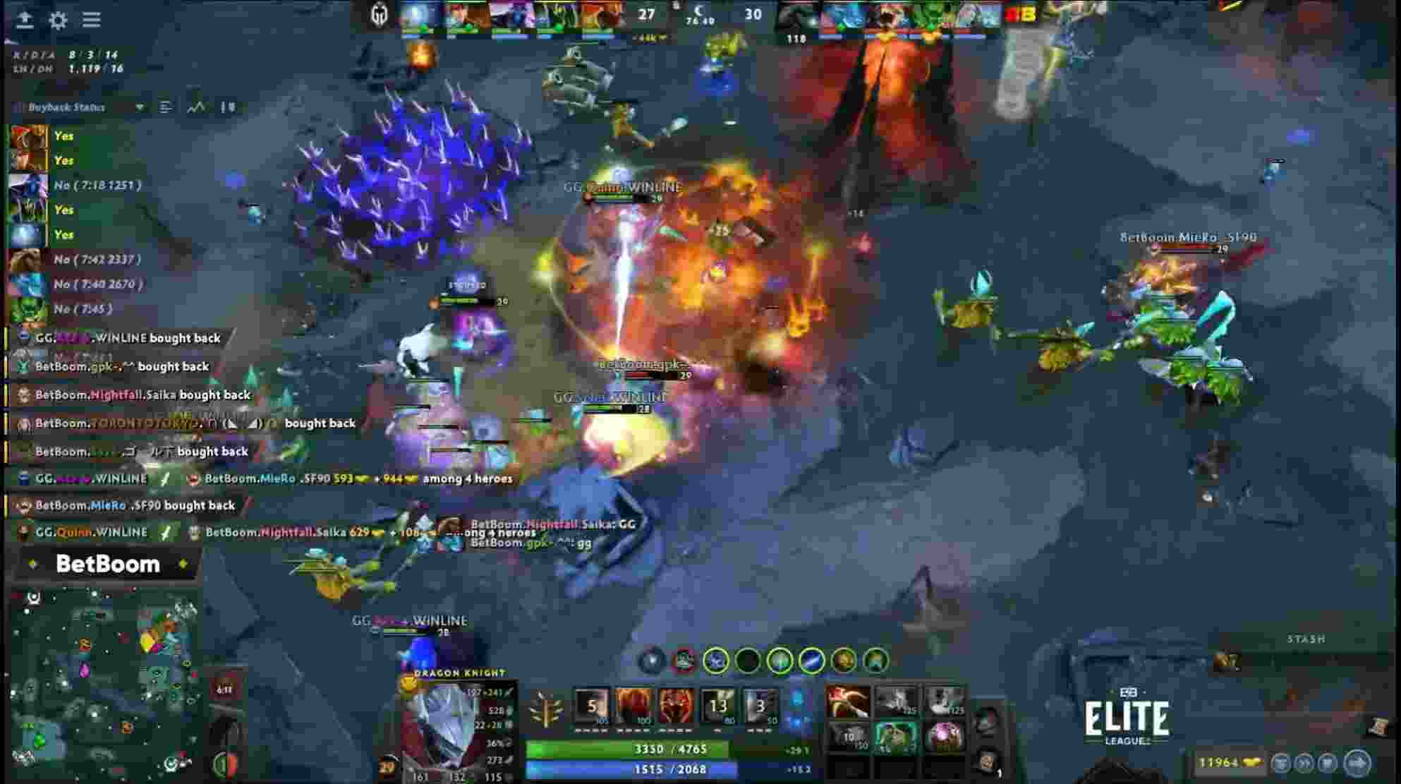 75分40秒GG带盾准备推基地,BB的高地内塔在25级精灵龙骑的面前就如同纸糊一样,1秒钟就被拆完。BB此时殊死一搏,獣先手跳大谜团配合队友集火击杀,谜团立马买活,同时团战开启,玛西开启BKB输出老鹿,几拳就将老鹿打成残血,此时买活谜团飞鞋刚好抵达战场,跳大拉住老鹿和小狗配合玛西的输出直接击杀两人,老鹿小狗立马买活,同时龙骑在侧面击杀骨法,玛西又收下冰女,骨法冰女也买活。但是在25级的小精灵龙骑面前,小狗根本扛不住被再次秒杀,随着老鹿也被玛西再次击杀,BB只能无奈敲出GG。