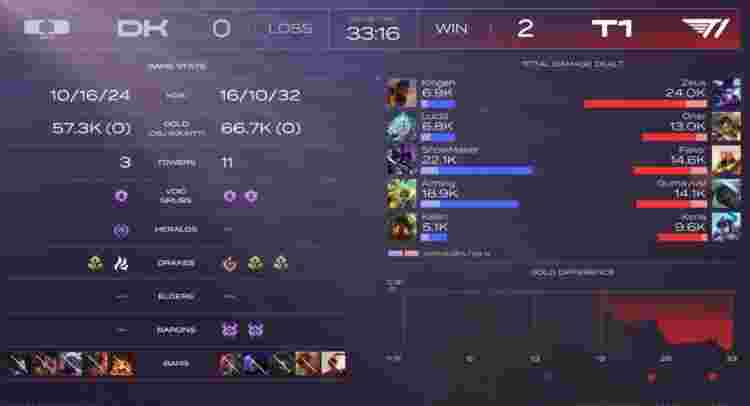 【32:30】T1再拿大龙之后推掉三路想一波,但是Zeus的VN装了被开直接暴毙了!DK五人拼命打输出但是最后一秒T1还是依靠Keria猪妹点基地成功拿下第二局比赛!
