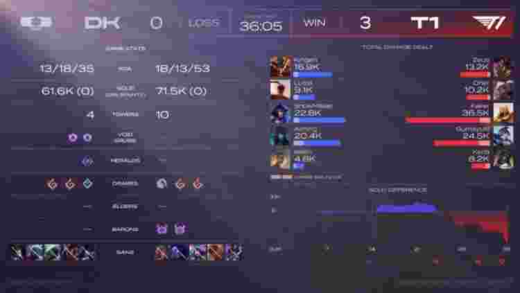 【19:40】河道Kellin泰坦被开,Zeus的VN猛猛开点配合Oner赵信打出0换3!T1打出0换4开打大龙,DK复活快回到战场想接盘,结果Keria猪妹绕后TP配合队友打了波包夹!Oner赵信被奎桑提带走切死,但是Zeus薇恩再次没人管了打出爆炸伤害收割了战场!T1再次打出1换4!两波打完经济差来到6K!
