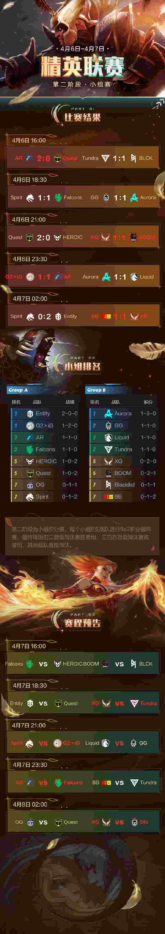4月7日,DOTA2官博发布了精英联赛二阶段小组赛第二日战况&第三日赛程,具体内容如下:
