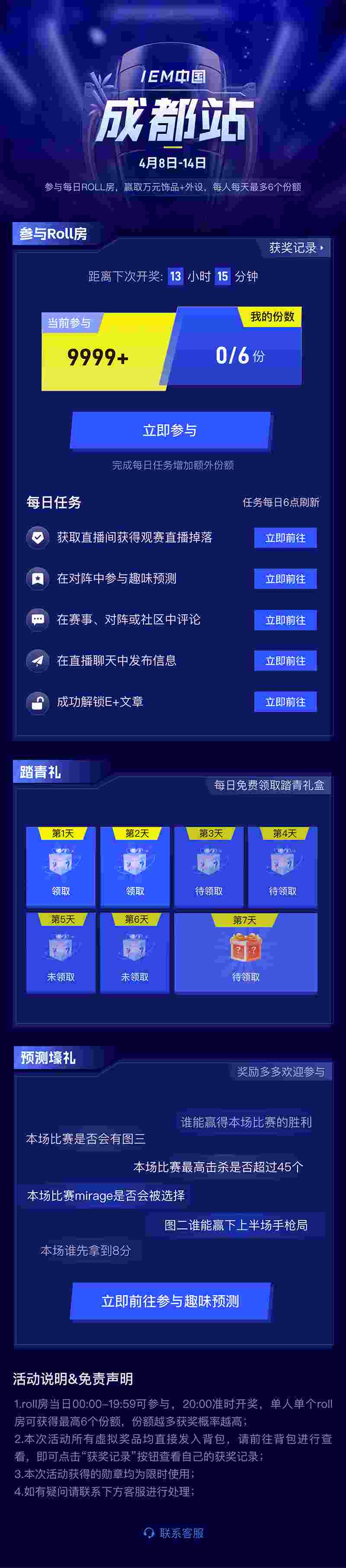 其次是踏青礼活动,在IEM成都的比赛期间,用户可通过每天签到来免费领取踏青礼盒。