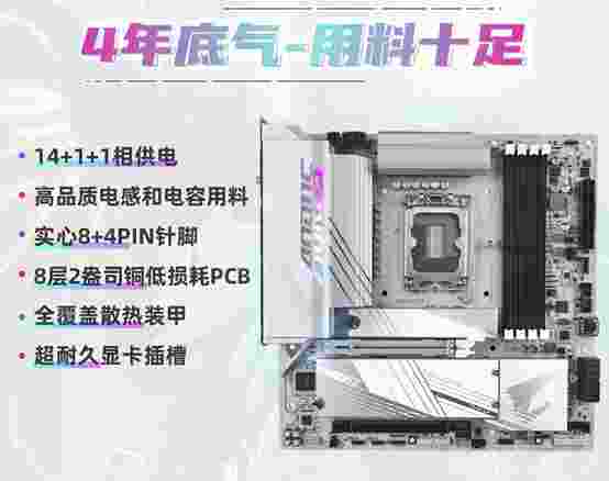 技嘉 B760M AORUS ELITE X AX 冰雕X,纯白的PCB与散热装甲搭配其他配件显得浑然一体,技嘉专门为14代酷睿准备的14+1+1相供电能够让i5-14600KF充分发挥所有性能,并且技嘉主板自身的内存超频优势能够将内存超频至同价位产品中最高的8266MHz,还有专属的D5黑科技能使内存获得更高的性能提升。扩展性方面,B760M 冰雕X配备了 2 个 PCI-E 4.0 M.2 插槽,4 条 DDR5 内存插槽,1*PCI-E 5.0x16 显卡插槽,同时该主板还支持4年超长质保(需注册)为用户的长期使用和后期扩展都做了完善考虑。