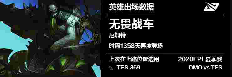 4月11日,LPL春季赛季后赛胜者组决赛TES对阵BLG的第二局比赛上,369选出厄加特对阵Bin的雷克塞,这也是厄加特是个1358天再次登上LPL的舞台,而上一次被选用是在2020年LPL夏季赛,由369选出