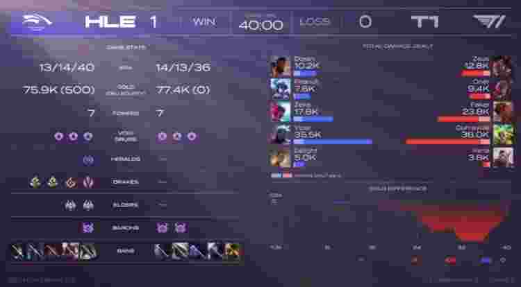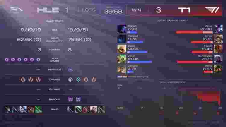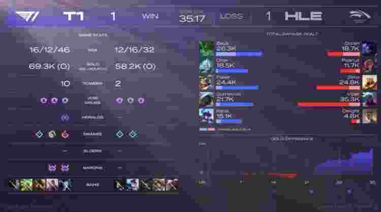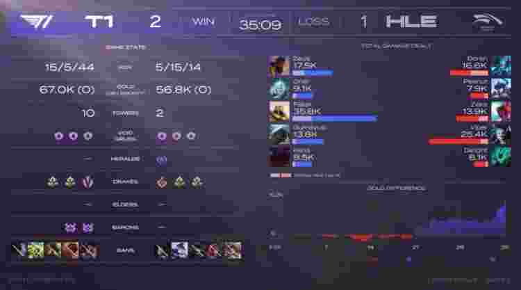 【35:59】蔚与卡牌在HLE野区被抓,韦鲁斯瞬间双杀,HLE打出0换3,远古龙继续刷新,HLE大龙远古龙双吃,三龙汇下路推进冲上T1高地,岩雀封路,卡牌上路带线,HLE强行高地开团秒杀Faker,永恩带走洛,HLE打出0换2推掉T1下路水晶撤退,大军压境,永恩R飞洛将其带走,HLE推掉T1基地先下一城。