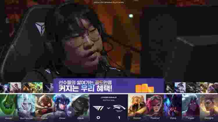 蓝色方T1:Zeus奎桑提、Oner佛耶戈、Faker沙皇、Gumayusi赛娜、Keria奥恩