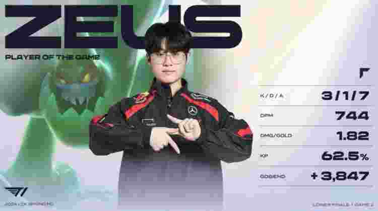 蓝色方T1:Zeus扎克、Oner佛耶戈、Faker库奇、Gumayusi赛娜、Keria猪妹