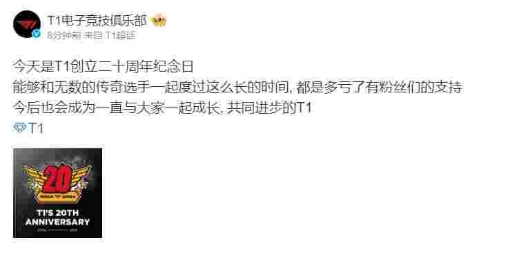 4月13日,T1俱乐部迎来了创立二十周年,T1官博更新:今天是T1创立二十周年纪念日,能够和无数的传奇选手一起度过这么长的时间, 都是多亏了有粉丝们的支持。今后也会成为一直与大家一起成长, 共同进步的T1。