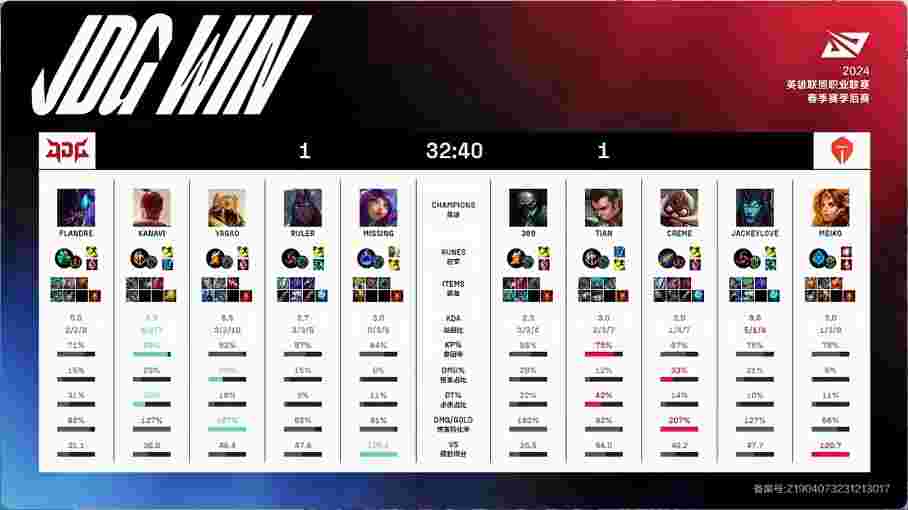 第19分半,野区开团,赵信捅到韦鲁斯,女坦补掉人头,沙皇冲脸推两人击杀赵信,盲僧踢死螃蟹,JDG打出1换2,经济反超1k。