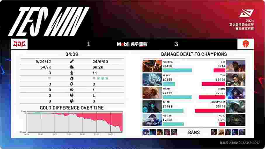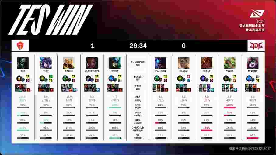 第30分半,TES冲上JDG高地,JDG中野射三人瞬间被融化,TES转下再推一路,经济领先8k。