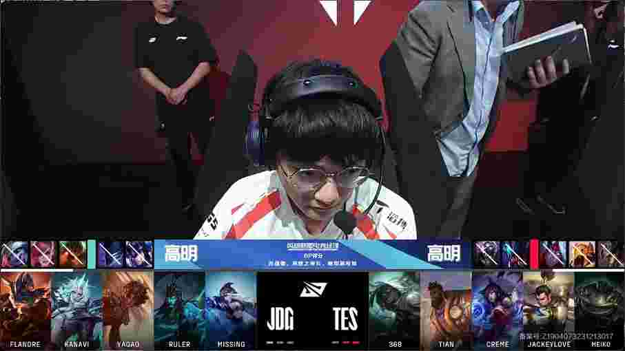 第15分钟,双方爆发先锋团,芮尔先拿先锋,岩雀抬到TES三人,泽丽瞬间双杀,螃蟹带走泽丽,沙皇开大也推到JDG三个,TES打出2换4,双方经济持平。