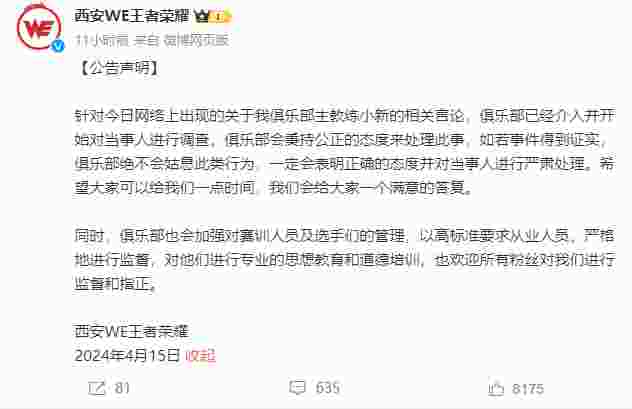 近日WE王者荣耀分部主教练小新被爆出家暴等负面新闻,随后WE王者荣耀发布公告,表示俱乐部开始调查主教练小新言论!