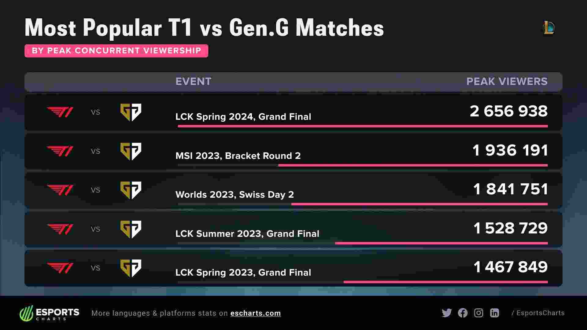 近日,LCK春季赛决赛GEN三比二击败T1,赛后外媒Esports Charts统计数据,排出了T1对阵GEN的比赛收视情况,2024年LCK春决为最受欢迎的T1 vs GEN比赛。