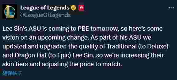 4月16日,LOL官推表示,在14.9版本盲僧的ASU美术更新实装后,【龙的传人】和【传统僧侣】两款皮肤将会涨价。【传统僧侣】将从23元档位涨价到45元档位。而【龙的传人】将涨价到89元档位。