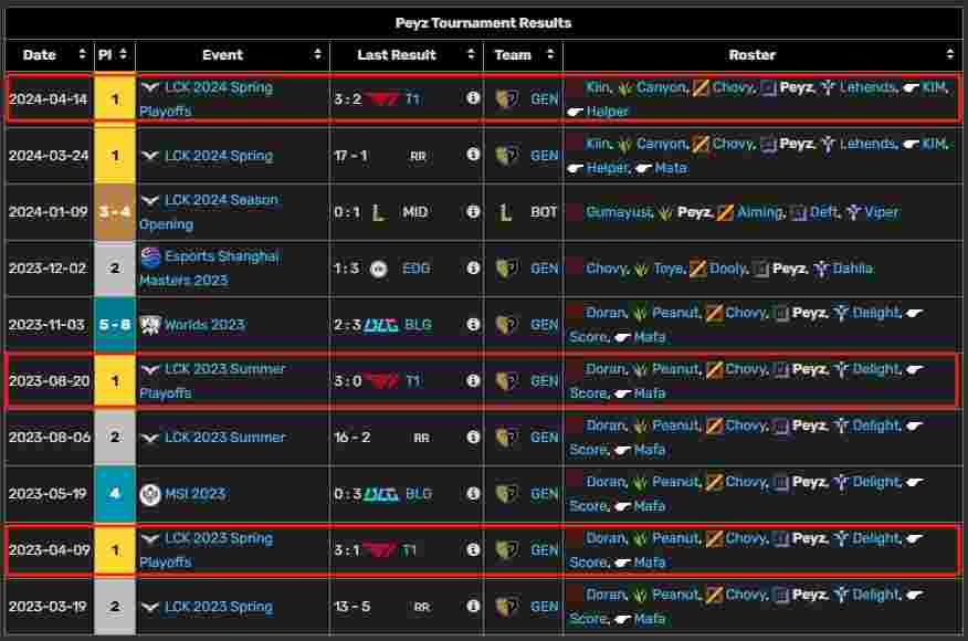Peyz自2023年春季赛登录LCK联赛开始,连续三个赛季(2023春、2023夏、2024春)都在季后赛中取得冠军