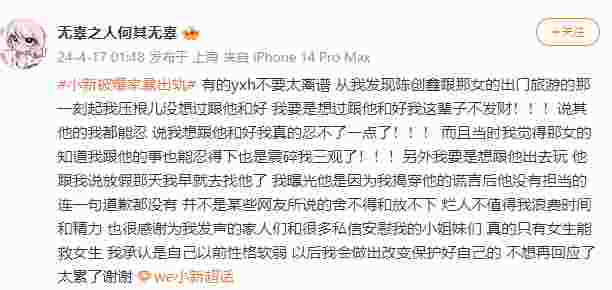 有的yxh不要太离谱 从我发现陈创鑫跟那女的出门旅游的那一刻起我压根儿没想过跟他和好 我要是想过跟他和好我这辈子不发财!!!说其他的我都能忍 说我想跟他和好我真的忍不了一点了!!! 而且当时我觉得那女的知道我跟他的事也能忍得下也是震碎我三观了!!!另外我要是想跟他出去玩 他跟我说放假那天我早就去找他了 我曝光他是因为我揭穿他的谎言后他没有担当的连一句道歉都没有 并不是某些网友所说的舍不得和放不下 烂人不值得我浪费时间和精力 也很感谢为我发声的家人们和很多私信安慰我的小姐妹们 真的只有女生能救女生 我承认是自己以前性格软弱 以后我会做出改变保护好自己的 不想再回应了太累了谢谢