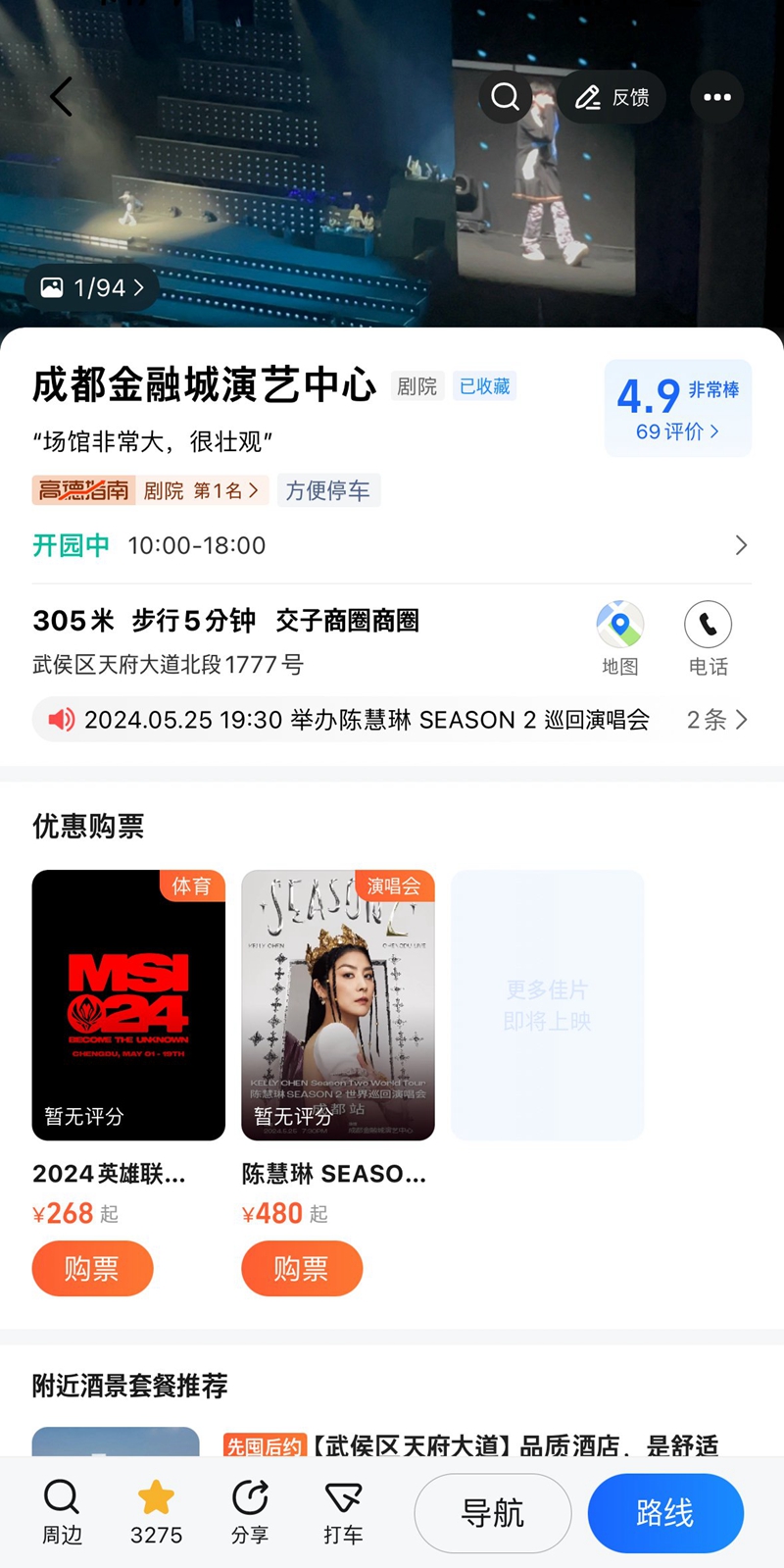 前往体育场(成都金融城演艺中心)所需准备物品:支付宝+高德地图