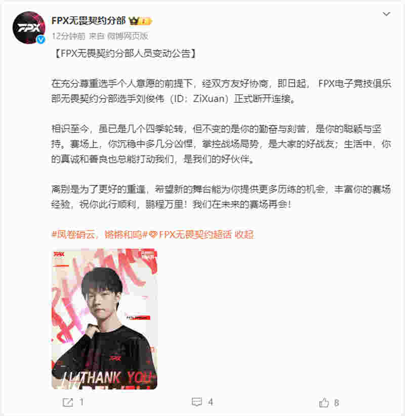 在充分尊重选手个人意愿的前提下,经双方友好协商,即日起, FPX电子竞技俱乐部无畏契约分部选手刘俊伟(ID:ZiXuan)正式断开连接。