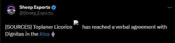 4月21日,据外媒Sheep Esports文章,北美联赛DIG战队将签下原Golden Guardians上单Licorice,换掉队内曾在LPL赛区V5战队效力的韩援Rich: