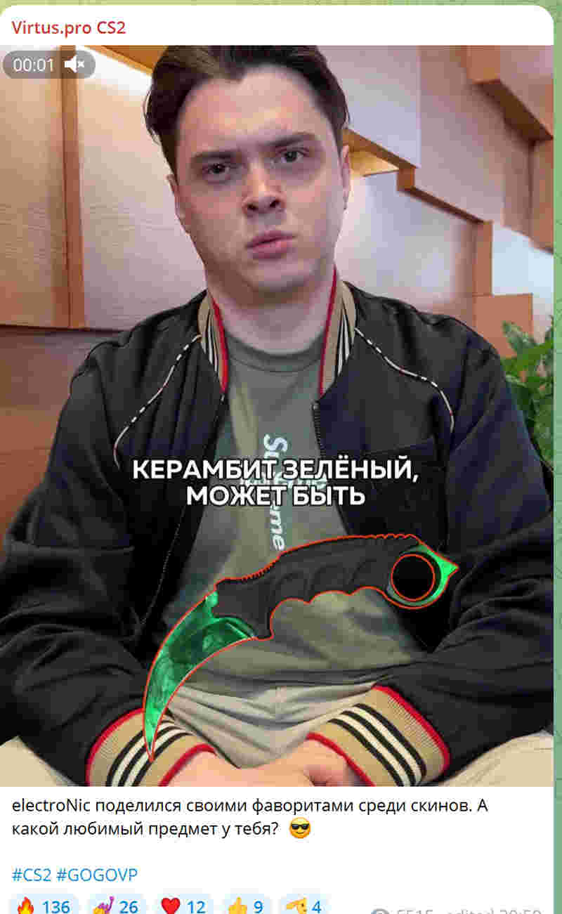 Denis Sharipov | electroNic在社交媒体的视频里回答了关于自己CS新版本饰品的问题,他选出了自己库存中最喜欢、最昂贵的皮肤。