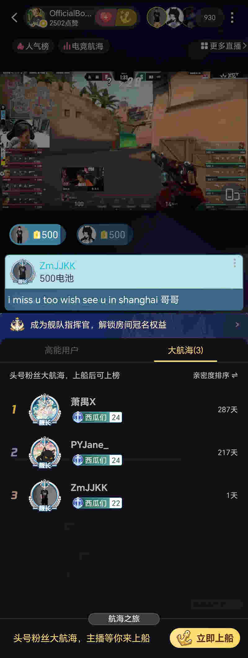 昨晚,Fnatic战队的大B老师Boaster在哔哩哔哩平台刚开播,“真爱粉”EDG康康就直接一波上舰支持,并在SC里写道——Boaster哥哥,我想念你,希望能在上海见到你。