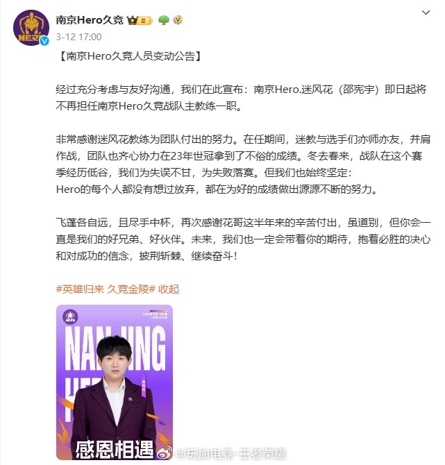 3月12日,迷风花卸任南京Hero久竞主教练一职;