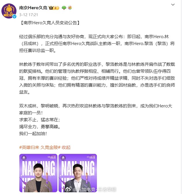 3月12日,吕成林正式担任南京Hero久竞战队主教练一职。