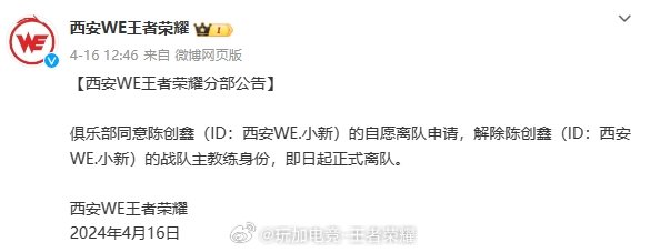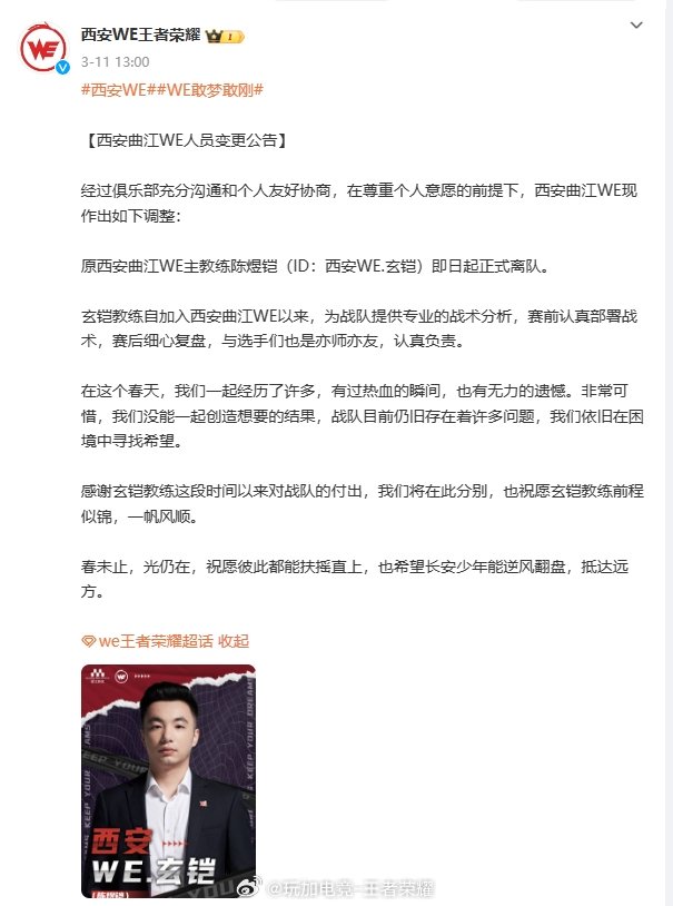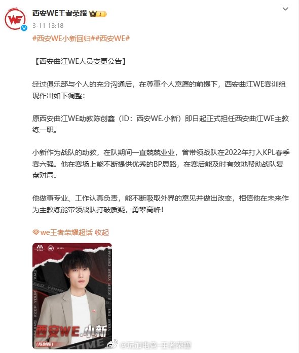 3月11日,小新正式担任西安曲江WE主教练一职;