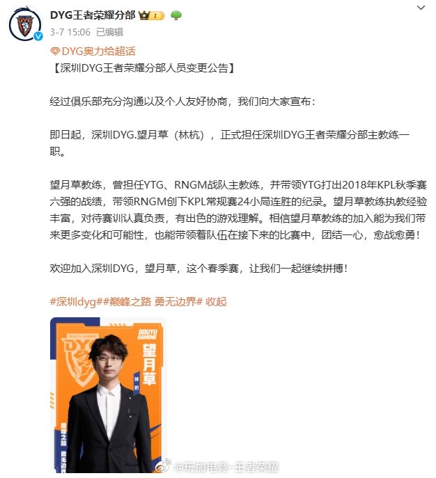 3月7日,望月草担任深圳DYG王者荣耀分部主教练一职。