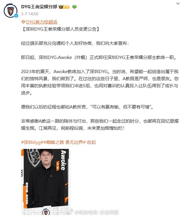 3月7日,Awoke卸任深圳DYG王者荣耀分部主教练一职;