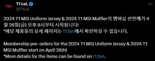 4月25日,LCK赛区T1战队官推发布了2024成都MSI队服: