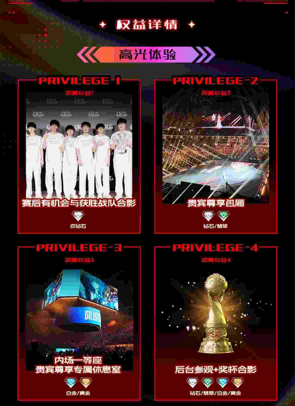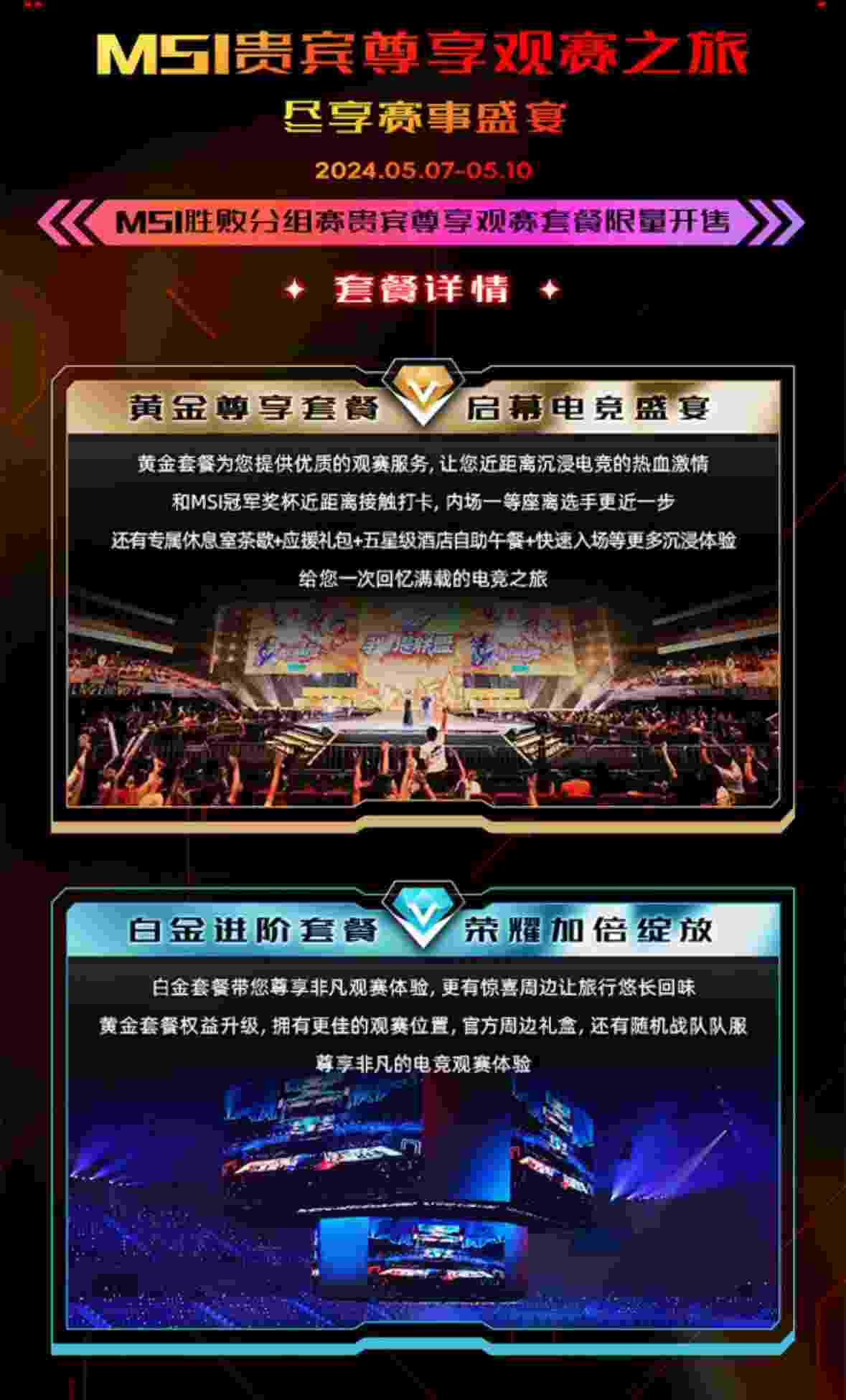 近日,有平台公布了MSI的贵宾尊享观赛套餐,5月7-10号的胜败分组赛,分为黄金-白金--翡翠-钻石套餐,价格从3888-9888四档,具体内容如图:
