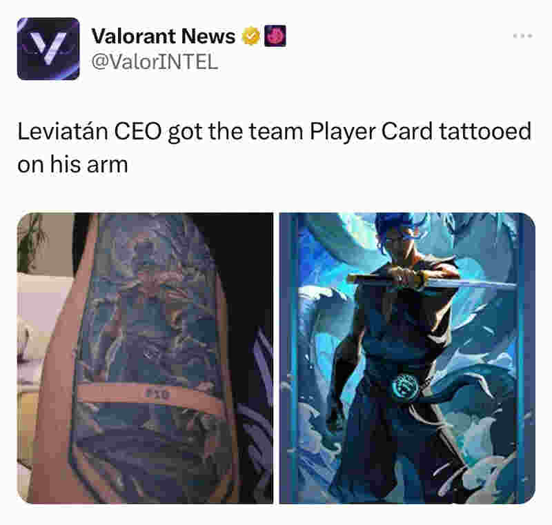 Leviatan战队 CEO将队伍卡面印在了手臂上,以前只听说过佩奇小猪身上纹,现在战队老板又整了个战队卡面身上纹。不知道有没有小伙伴的收藏里有LEV卡面的?大家都买了哪个战队的捆绑包,还是说在等CN赛区的,我是准备等CN瓦的卡面!