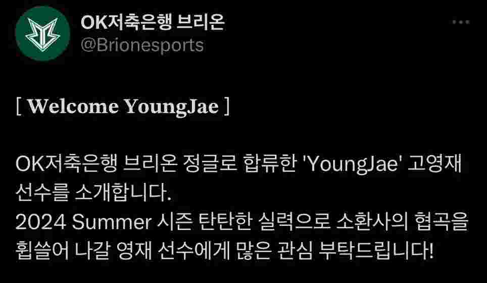 隆重介绍加入 OK 储蓄银行 Brion Jungle 的高英宰“YoungJae”。